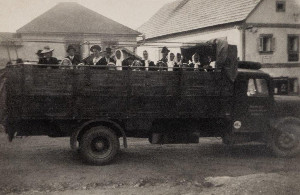 offener LKW zur anfänglichen Personenbeförderung, quer montierte Bretter dienten als Sitzfläche